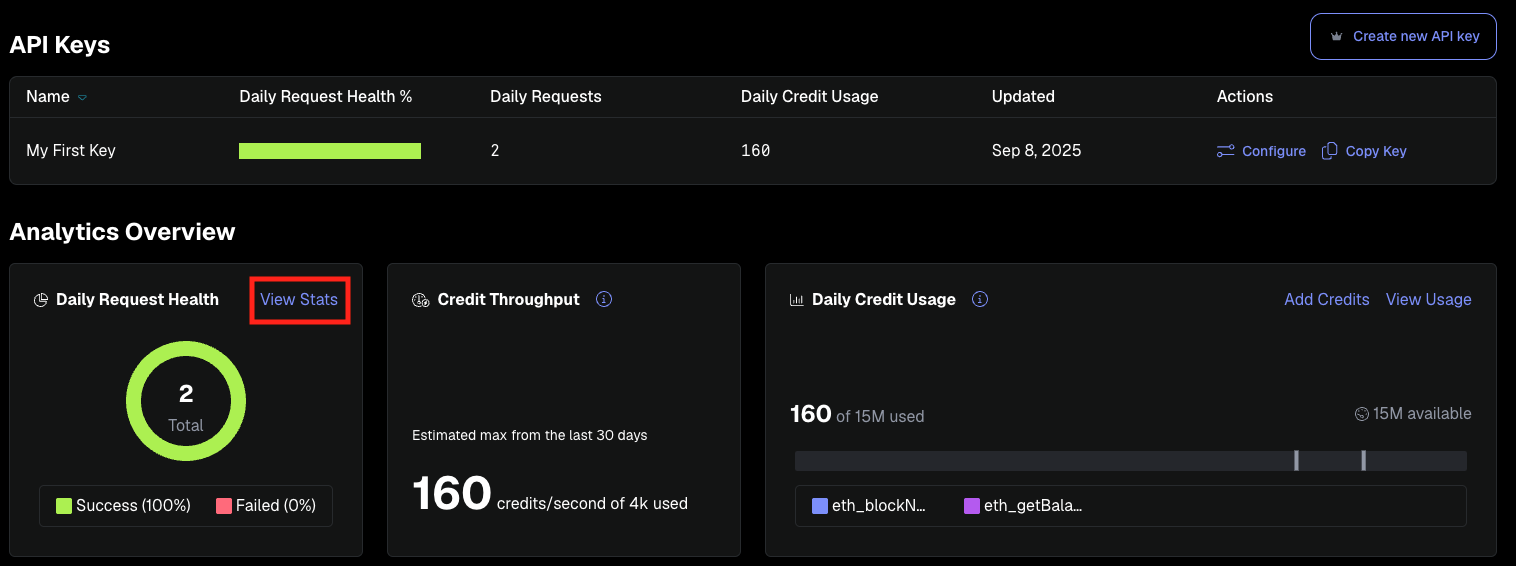 The dashboard displays an overview of your daily request health and credit usage. Select View Stats or Stats (in the left navigation) to monitor your project request stats.